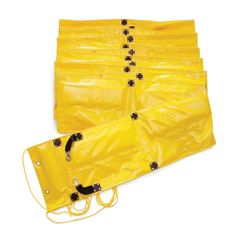 • Floating spill containment boom corrals liquids and debris up to 6″ above the waterline, while the draft extends 12″ below to block pollutants